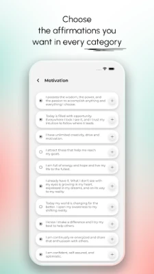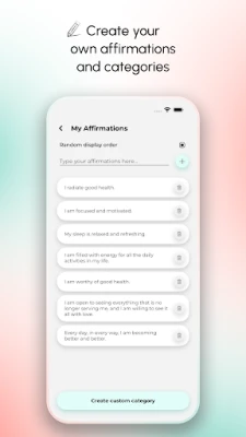 Atklājiet plašu afirmāciju klāstu, kas sadalītas ērtās kategorijās – veselība, motivācija, pašmīlestība, laime, panākumi un vēl daudz vairāk, lai atrastu tieši to, kas atbalsta jūsu pašreizējo noskaņojumu un mērķus. Personalizējiet savu pieredzi, izvēloties pielāgotus fonus un saņemot ikdienas atgādinājumus, kas iedvesmo. Vēl vairāk, "Daily Affirmations Mirror" sniedz jums brīvību radīt savas unikālas afirmācijas un organizēt tās personīgās kategorijās, padarot jūsu izaugsmes ceļu patiesi jūsu. Veidojiet pozitīvas domāšanas ieradumu, stipriniet savu pašsajūtu un virzieties pretī savu sapņu piepildīšanai.