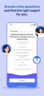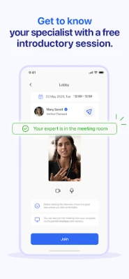 Šī lietotne palīdz jums uzlabot pašsajūtu. Sāciet savu ceļu uz labāku labsajūtu jau šodien, atrodot piemērotākos terapeitus. Uzsāciet ērtu tiešsaistes terapijas ceļojumu un saņemiet profesionālu atbalstu no jebkuras vietas pasaulē.