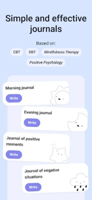 Moodi integrē vairākus efektīvus pašpalīdzības rīkus. **Negatīvo situāciju dienasgrāmata** ļauj detalizēti analizēt saspringtus un satraucošus brīžus, identificēt domāšanas modeļus un izstrādāt efektīvas reakcijas nākotnei. Tā palīdz atbrīvot prātu no negatīvisma, mainot pieeju problēmu risināšanai. Pretstatā, **Pozitīvo mirkļu dienasgrāmata**, ko var dēvēt arī par pateicības žurnālu, virza uzmanību uz priecīgiem notikumiem un pateicību, mazinot stresu un veicinot optimisma vairošanos. Turklāt, **Rīta dienasgrāmata** kalpo kā pamats produktīvai dienai, palīdzot atbrīvoties no nevajadzīgām rūpēm un stiprinot enerģiju, motivāciju un radošumu. Savukārt, **Vakara dienasgrāmata** piedāvā pārdomāt aizgājušo dienu, atbrīvoties no spriedzes un veicināt dziļāku, mierīgāku miegu.